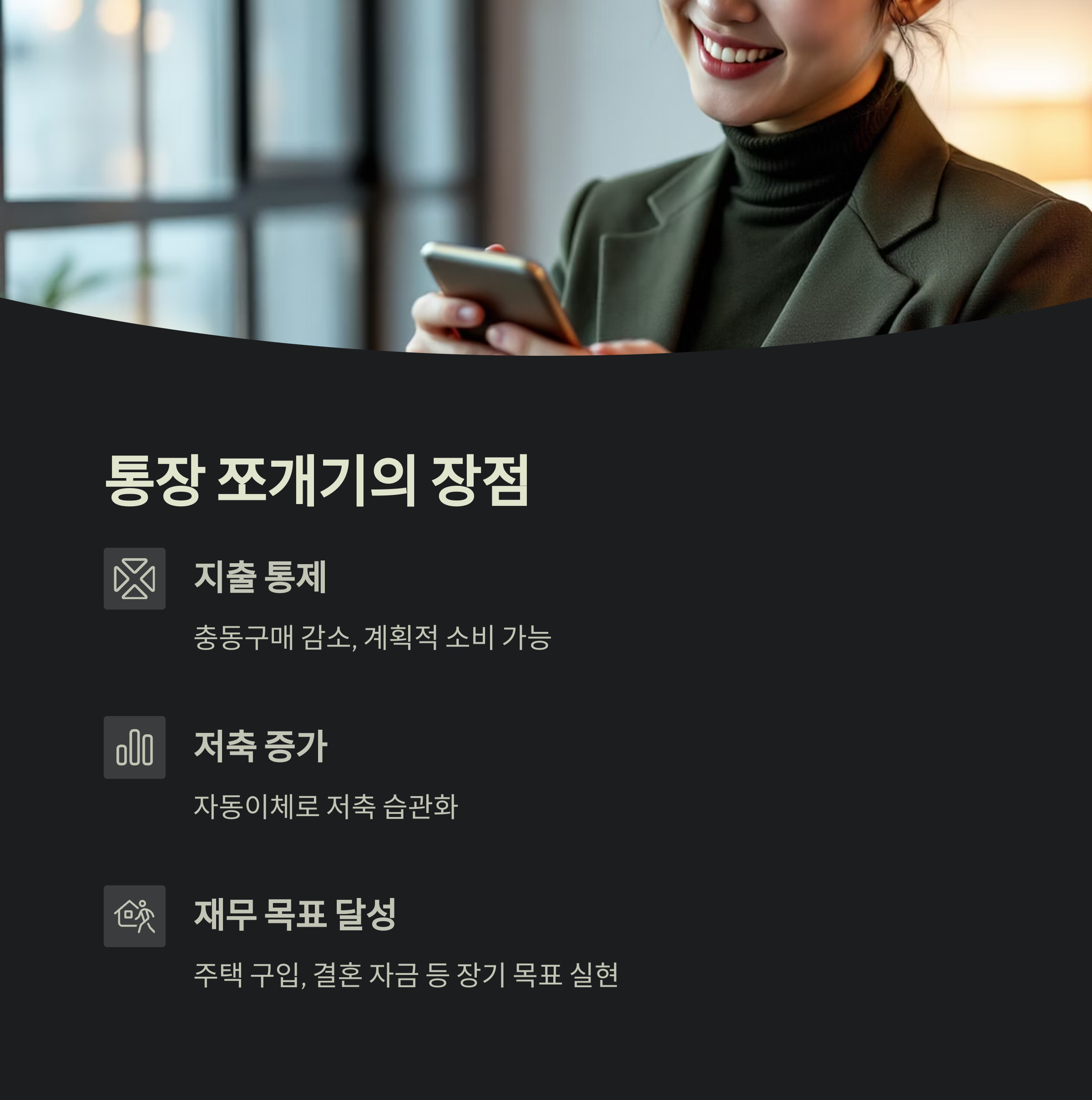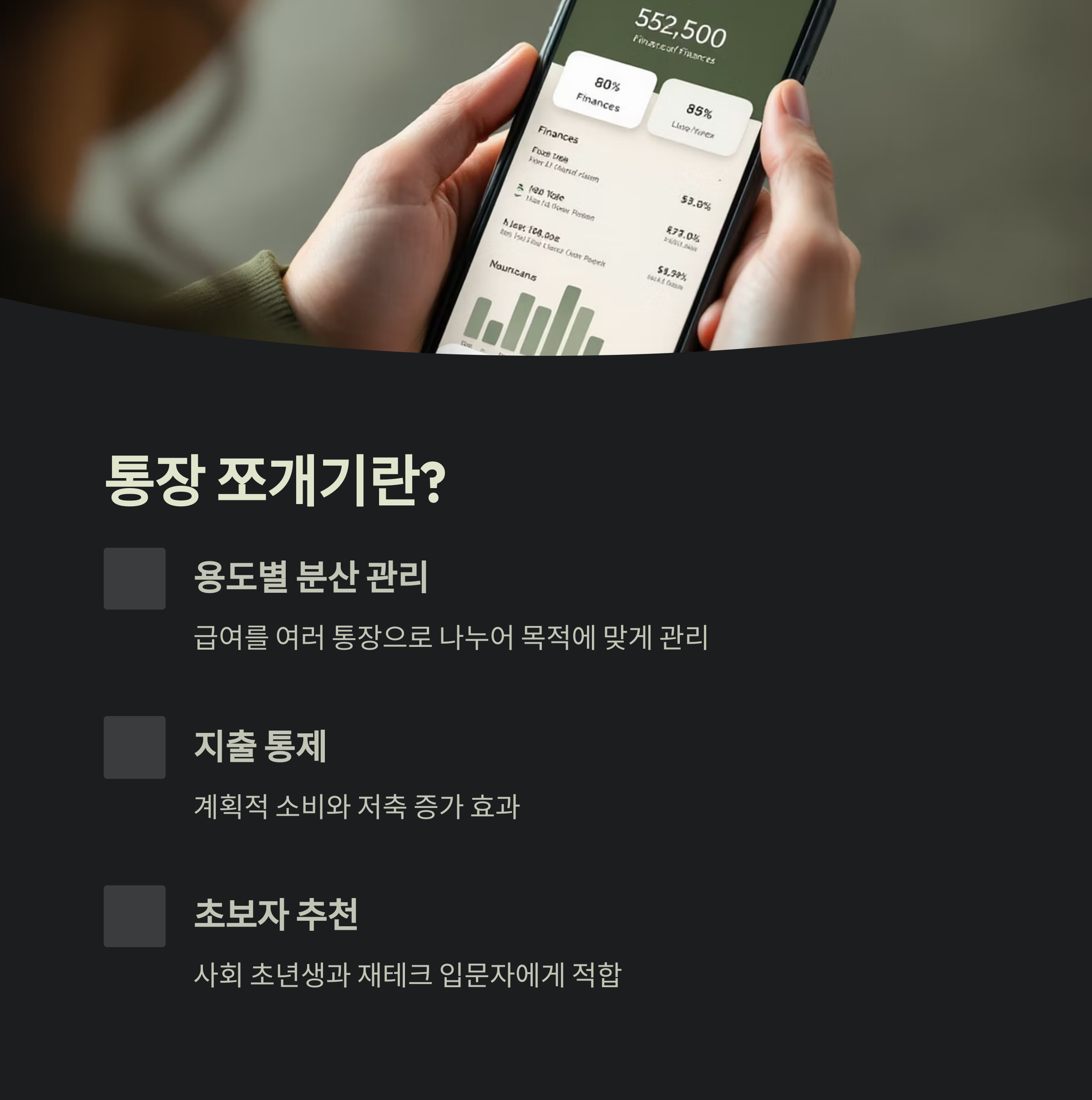 통장 쪼개기는 급여를 받은 후 용도에 따라 여러 개의 통장으로 자금을 분산하여 관리하는 방법입니다. 이렇게 하면 지출을 계획적으로 통제하고, 저축 및 투자를 체계적으로 할 수 있습니다. 특히 사회 초년생이나 재테크를 시작하는 분들에게 유용한 방법입니다