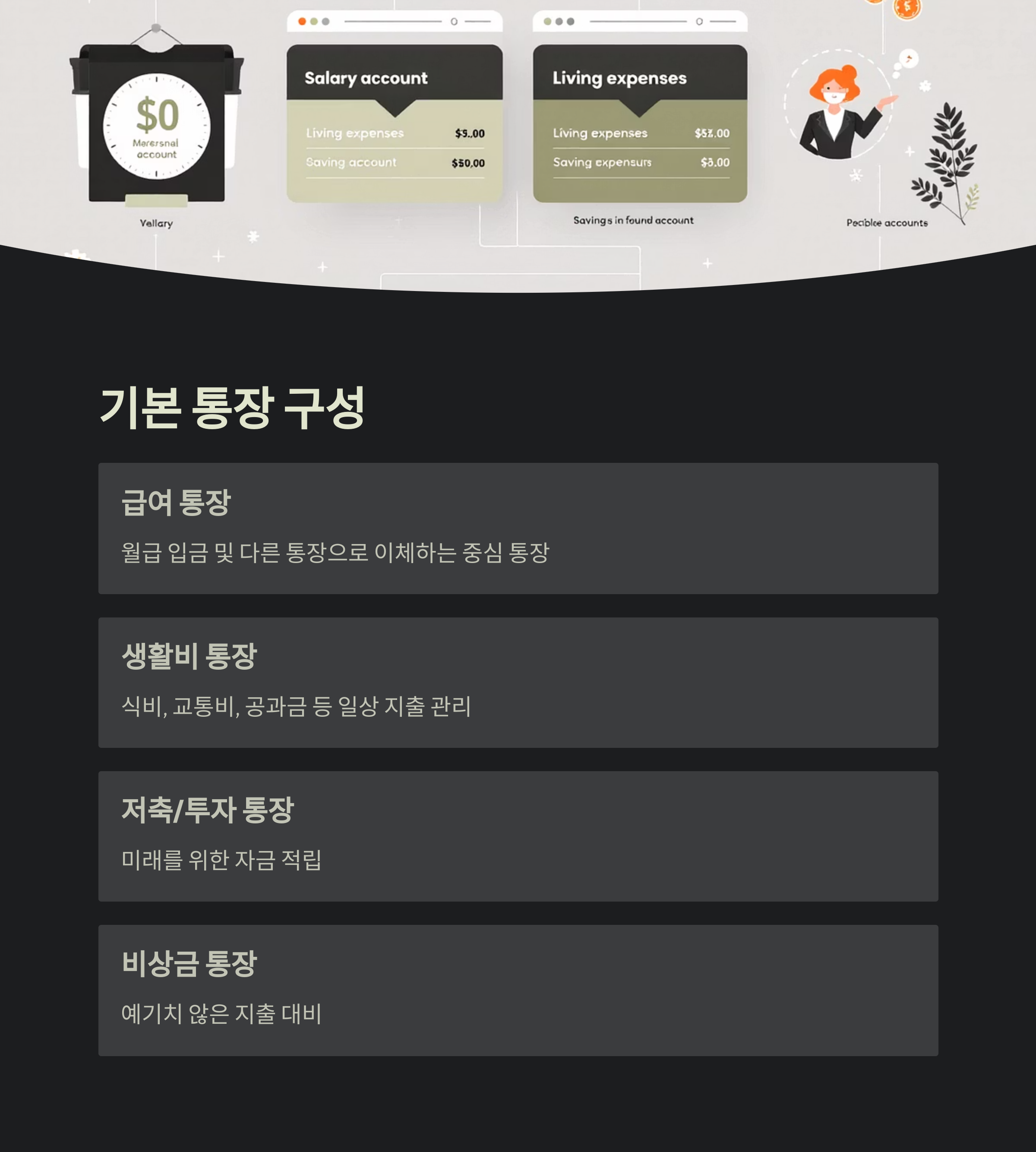 - 비상금 통장: 예기치 않은 지출에 대비한 자금을 보관하는 통장입니다. 의료비, 경조사비 등이 해당됩니다.