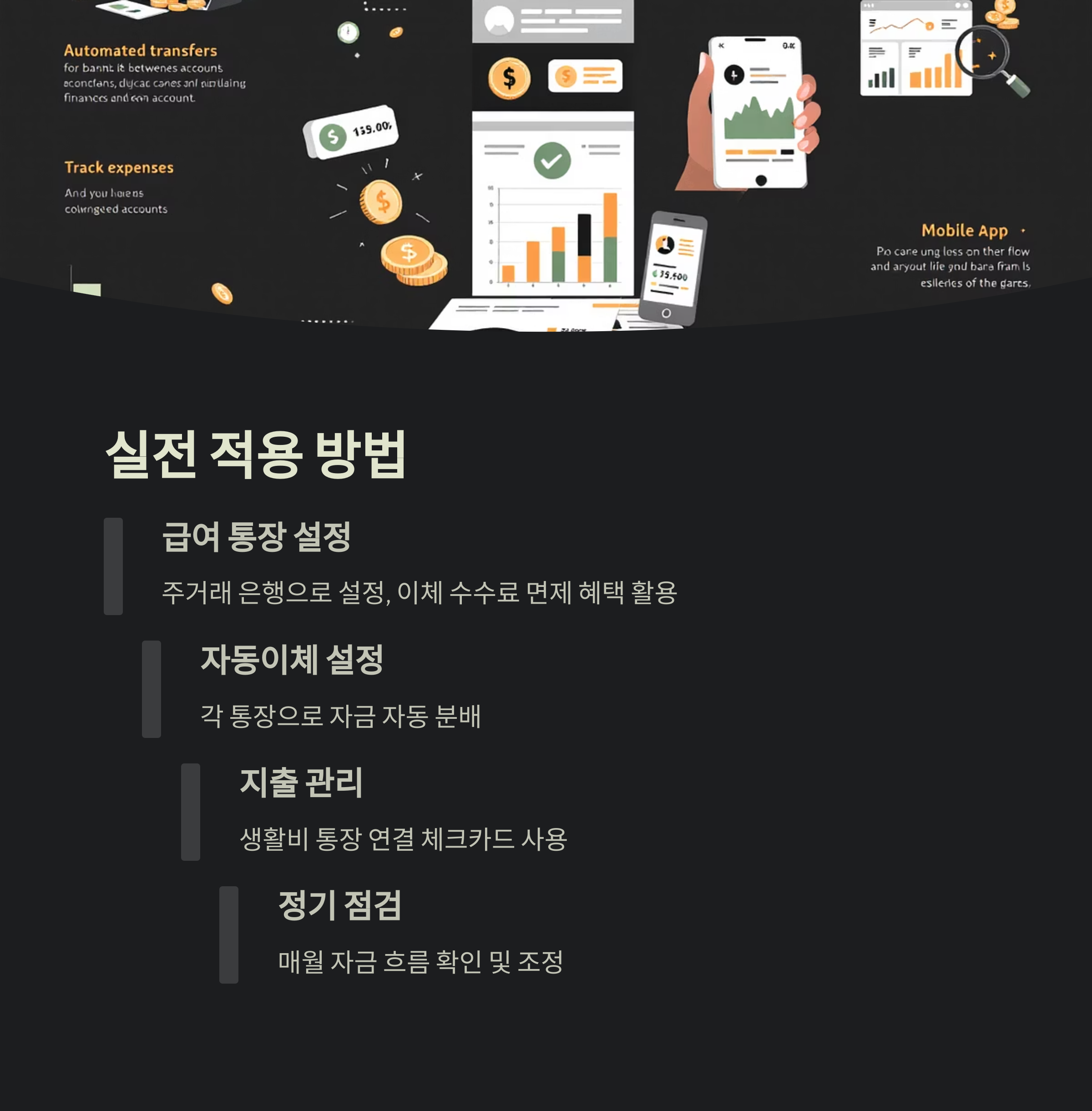 - 자동이체 설정: 각 통장으로 자금을 자동이체 설정하여, 자금 분배를 자동화합니다.