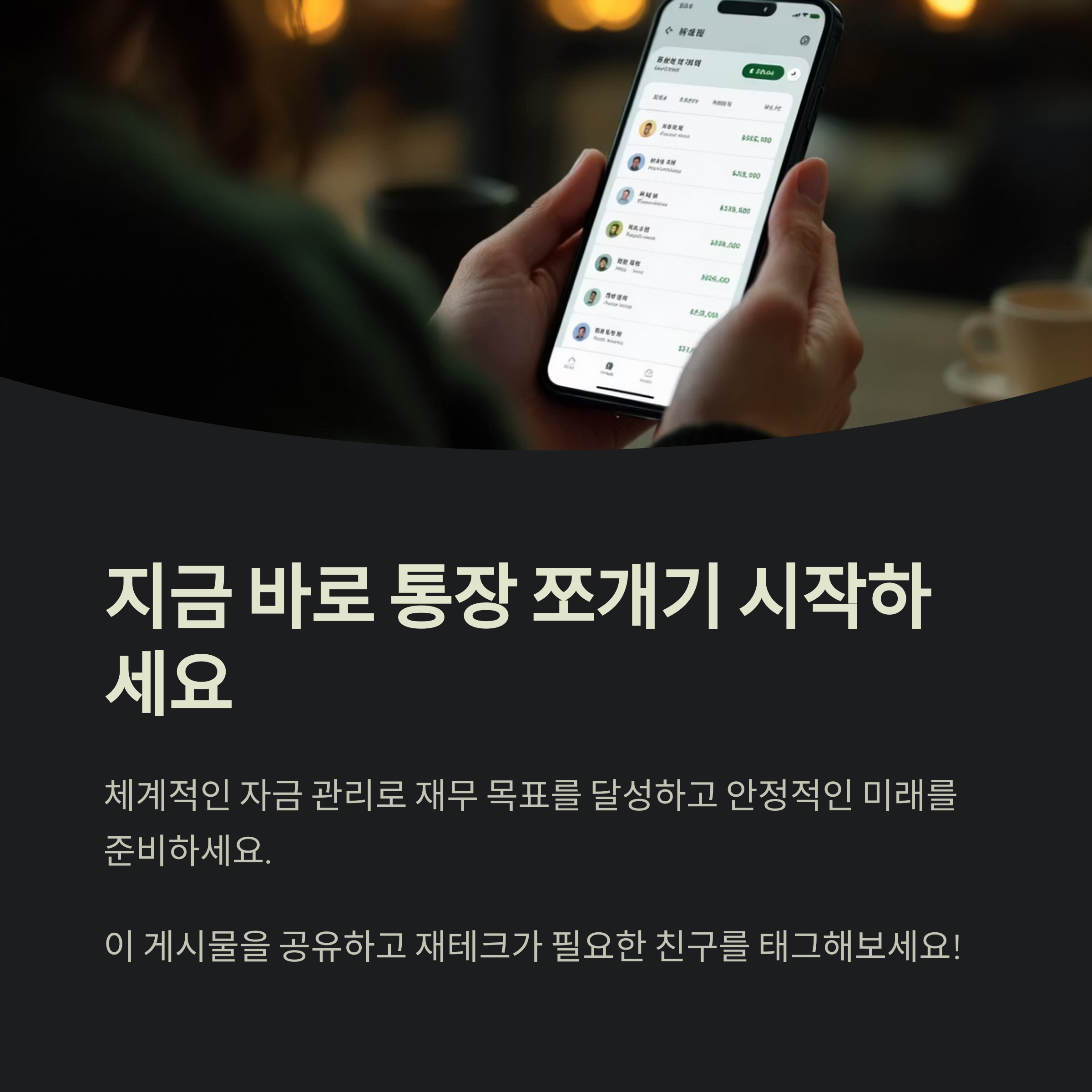 통장 쪼개기는 재테크의 기초를 다지는 데 효과적인 방법입니다. 자신의 소비 습관을 점검하고, 체계적인 자금 관리를 통해 재무 목표를 달성해 보세요.