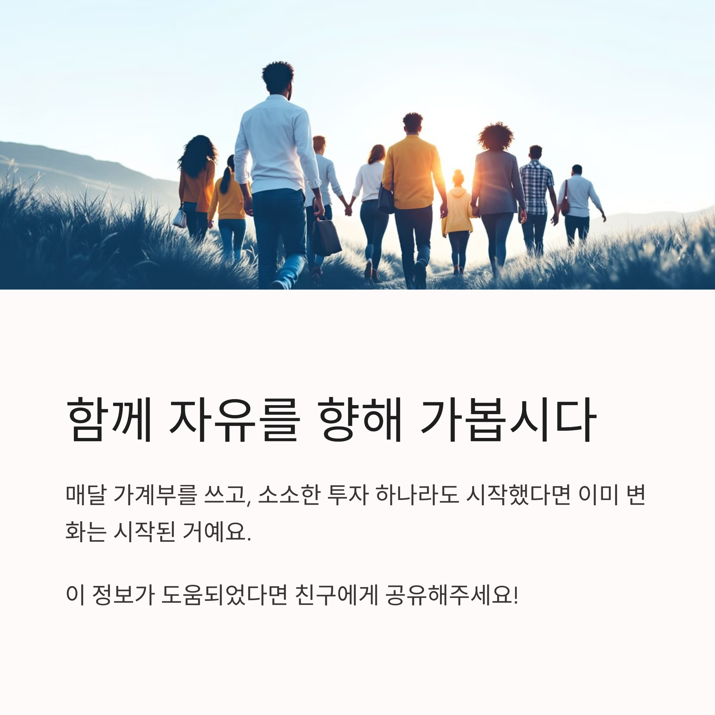 조기 은퇴가 목적이 아니어도, 자산을 스스로 관리하고 삶의 주도권을 되찾고 싶다면 그 자체로 파이어족의 시작입니다. 이 글이 여러분의 첫걸음이 되길 바랍니다. 매달 가계부를 쓰고, 소소한 투자 하나라도 시작했다면 이미 변화는 시작된 거예요. 혼자 걷기 어려울 땐 함께 걸으면 됩니다. 우리 같이 천천히, 하지만 확실하게 자유를 향해 가봅시다.