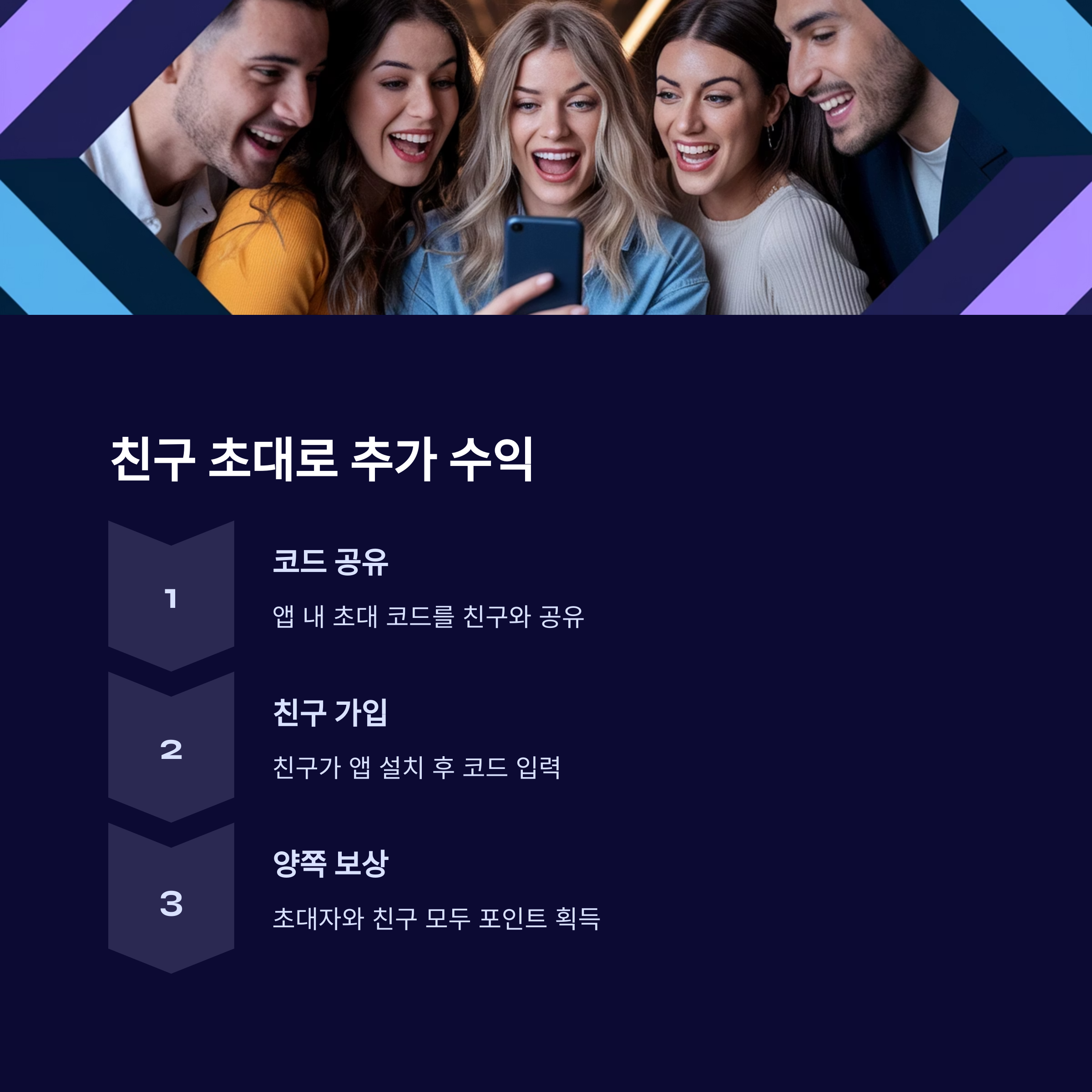 • 친구가 앱을 설치하고 회원가입 후 초대 코드를 입력하면, 양쪽 모두 포인트를 획득합니다.
