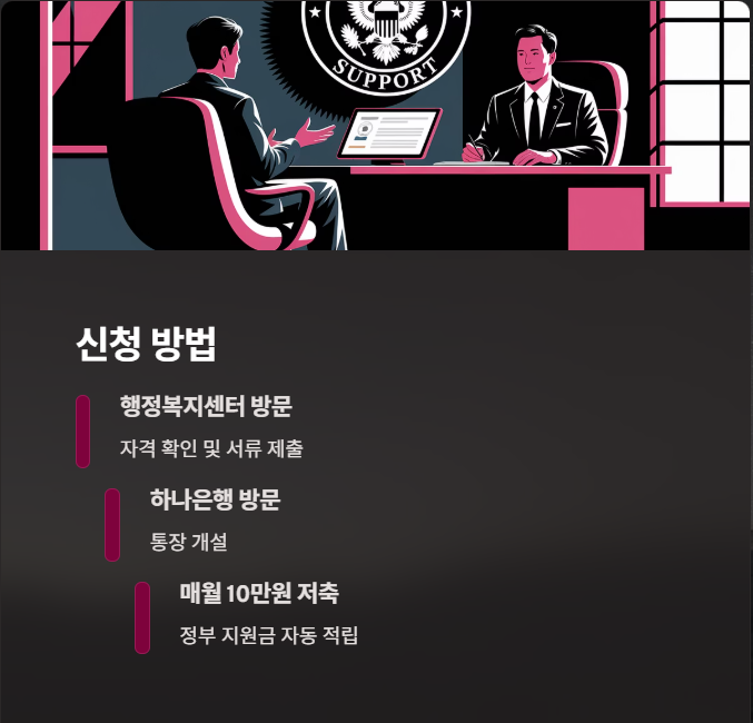 - 관할 행정복지센터 방문 → 자격 확인 → 서류 제출 → 하나은행에서 통장 개설