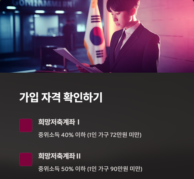 생계·의료급여 수급자 또는 차상위 계층으로, 중위소득 40% 이하인 경우 신청 가능합니다. 예를 들어, 1인 가구 기준 월 소득 인정액이 72만 원 미만이어야 합니다. - 희망저축계좌Ⅱ: