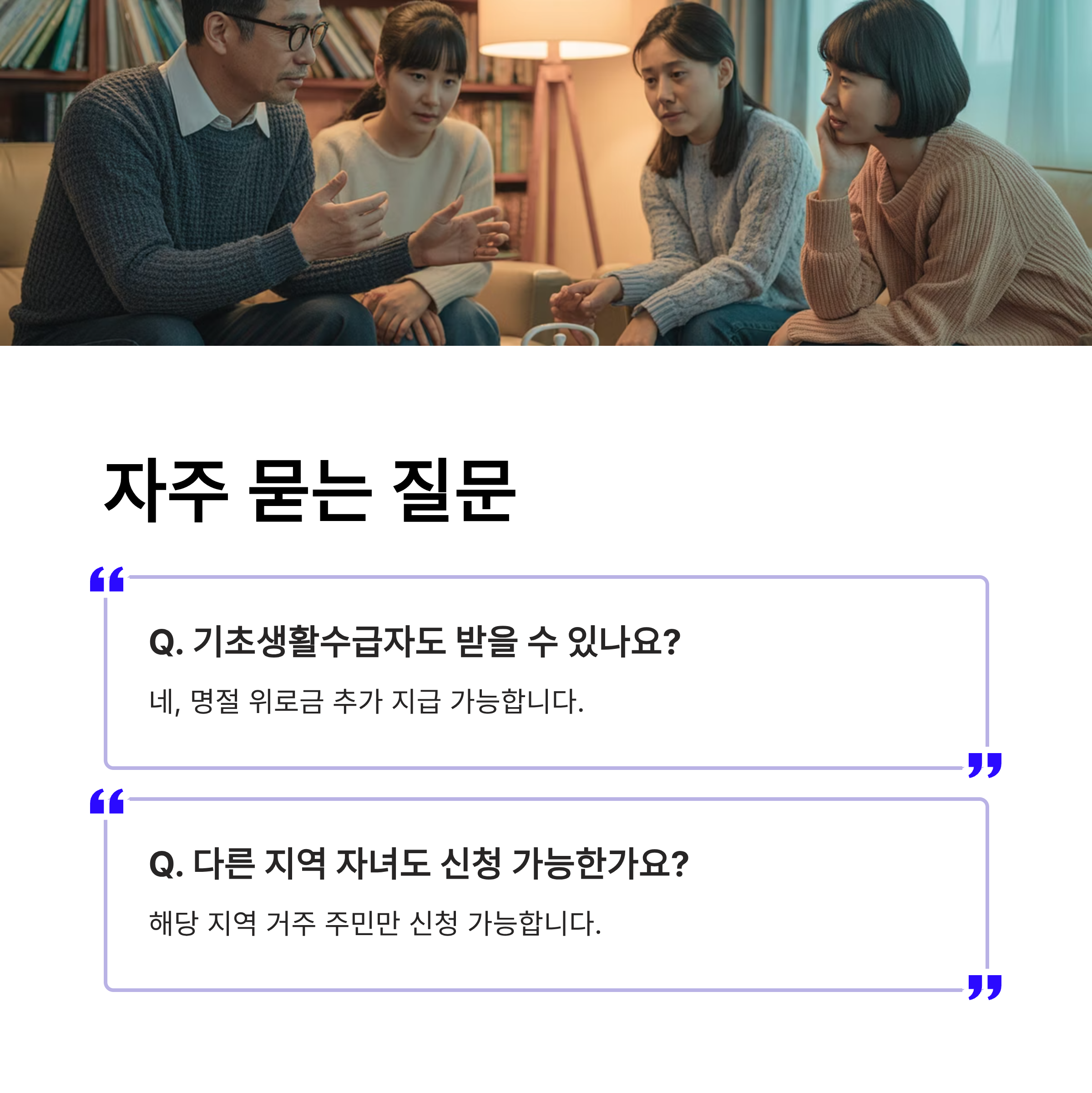 - Q. 기초생활수급자도 2025년 경기도 추석지원금을 받을 수 있나요? A. 네, 대부분의 지자체에서 기초생활수급자는 명절 지원금의 주요 대상에 포함됩니다. 일반 지원금 외에도 별도의 명절 위로금을 추가로 받을 수 있는 경우가 많으니 해당 시군에 문의해 보세요.