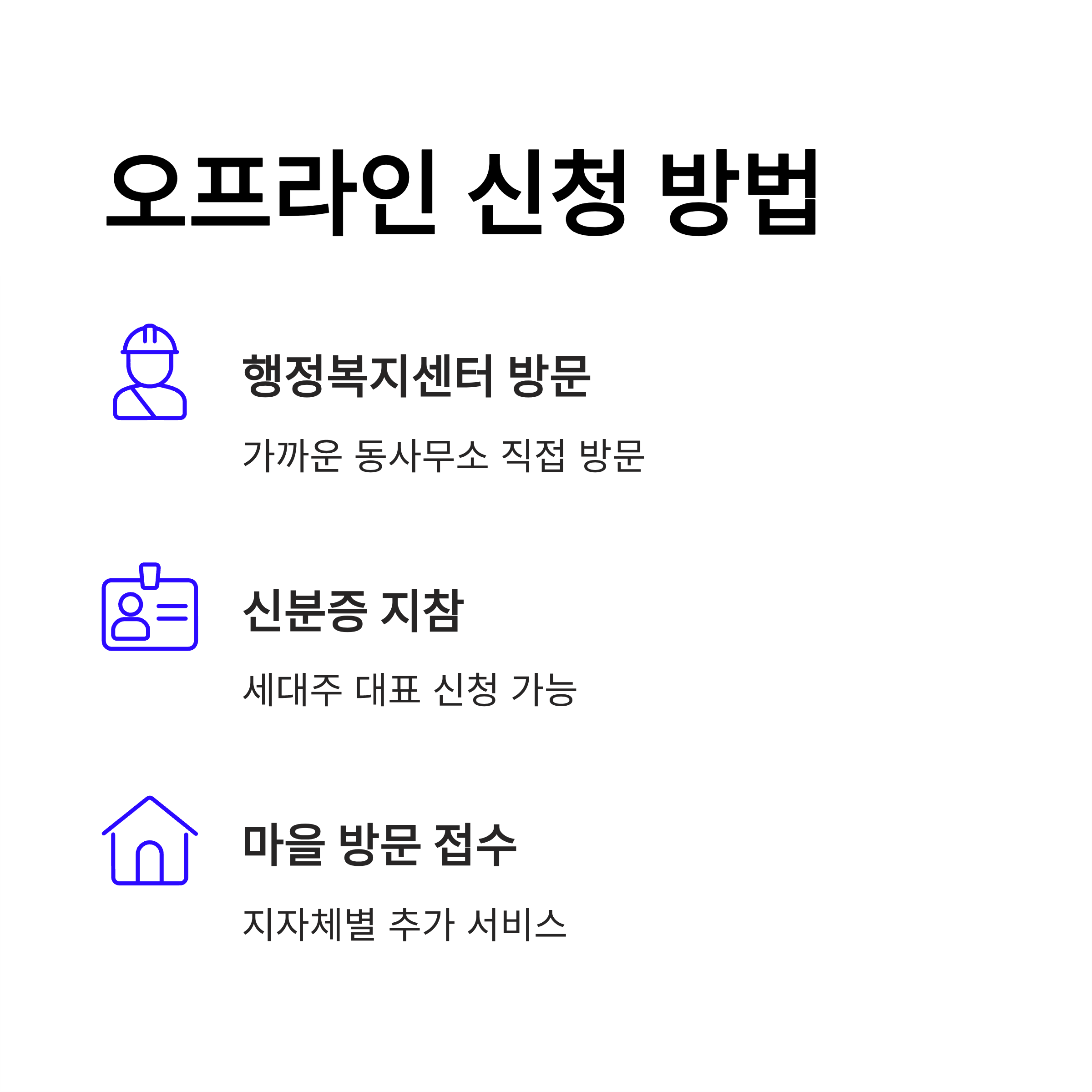 온라인 신청이 어려운 분들을 위해 가까운 행정복지센터(동사무소)를 직접 방문하여 신청하는 방법도 있습니다. 신분증 등 기본 서류를 지참하고 방문하면 되며, 가족 단위로 신청하는 경우 세대주가 대표로 신청할 수 있습니다. 이 외에도 지자체에 따라서는 마을 방문 신청 접수를 받기도 하니, 거주지 행정복지센터에 문의하여 정확한 신청 절차를 확인하는 것이 좋습니다.