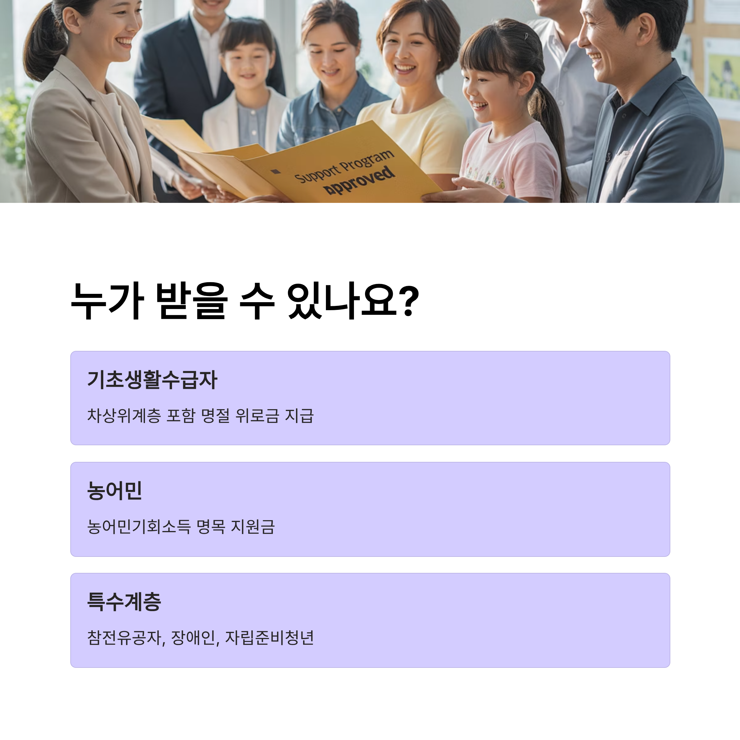 경기도 추석지원금은 경기도민 전체에게 일괄적으로 지급되는 방식이 아닌, 특정 취약 계층이나 조건에 부합하는 가구를 대상으로 지급되는 경우가 많습니다. 2025년 경기도 명절 지원금의 주요 대상은 다음과 같습니다.