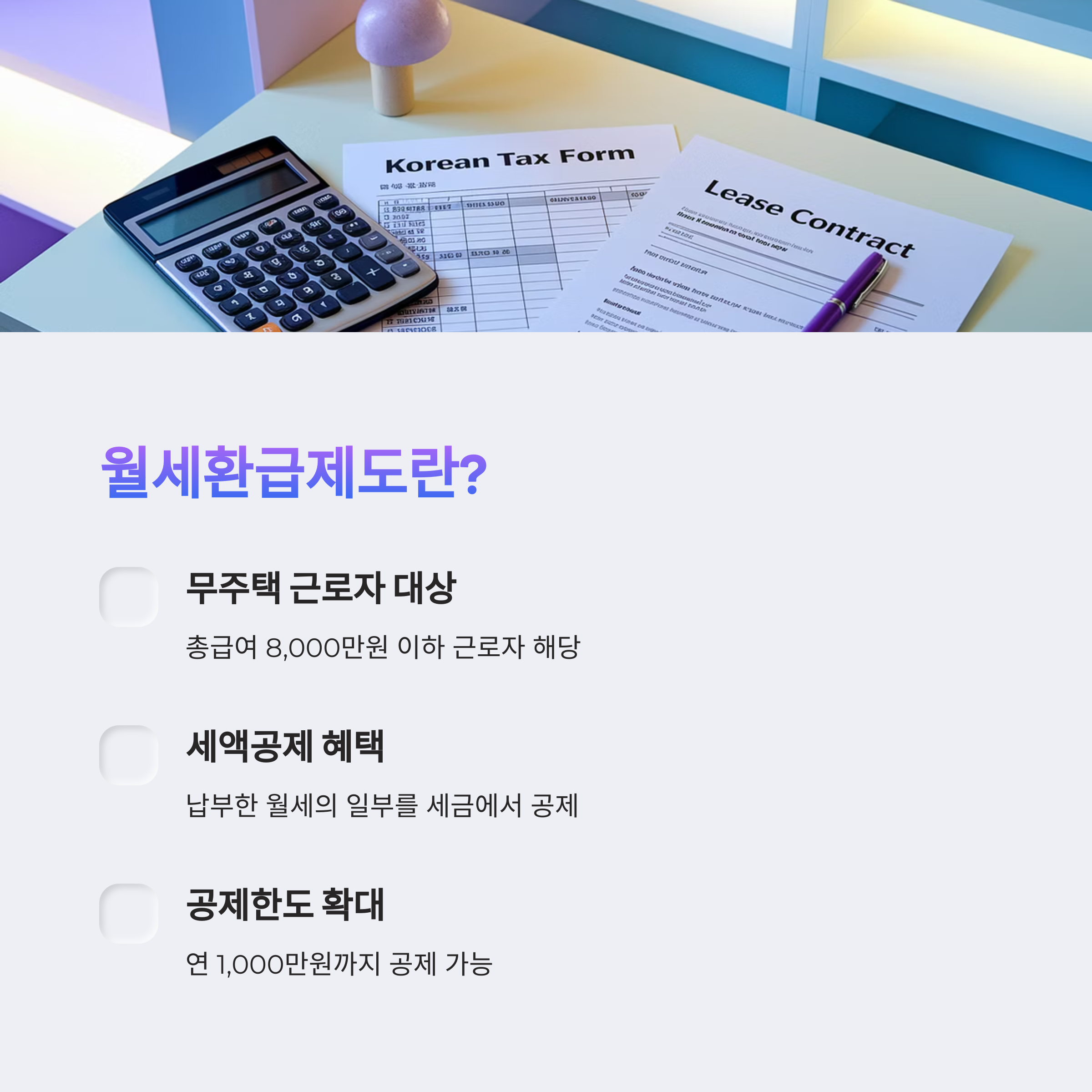 월세환급제도는 무주택 근로자가 일정 요건을 충족할 경우, 납부한 월세의 일부를 세액에서 공제받을 수 있는 제도입니다. 2025년부터는 총급여 8,000만 원 이하의 근로자까지 대상이 확대되었으며, 공제 한도도 연 1,000만 원으로 상향되었습니다 .