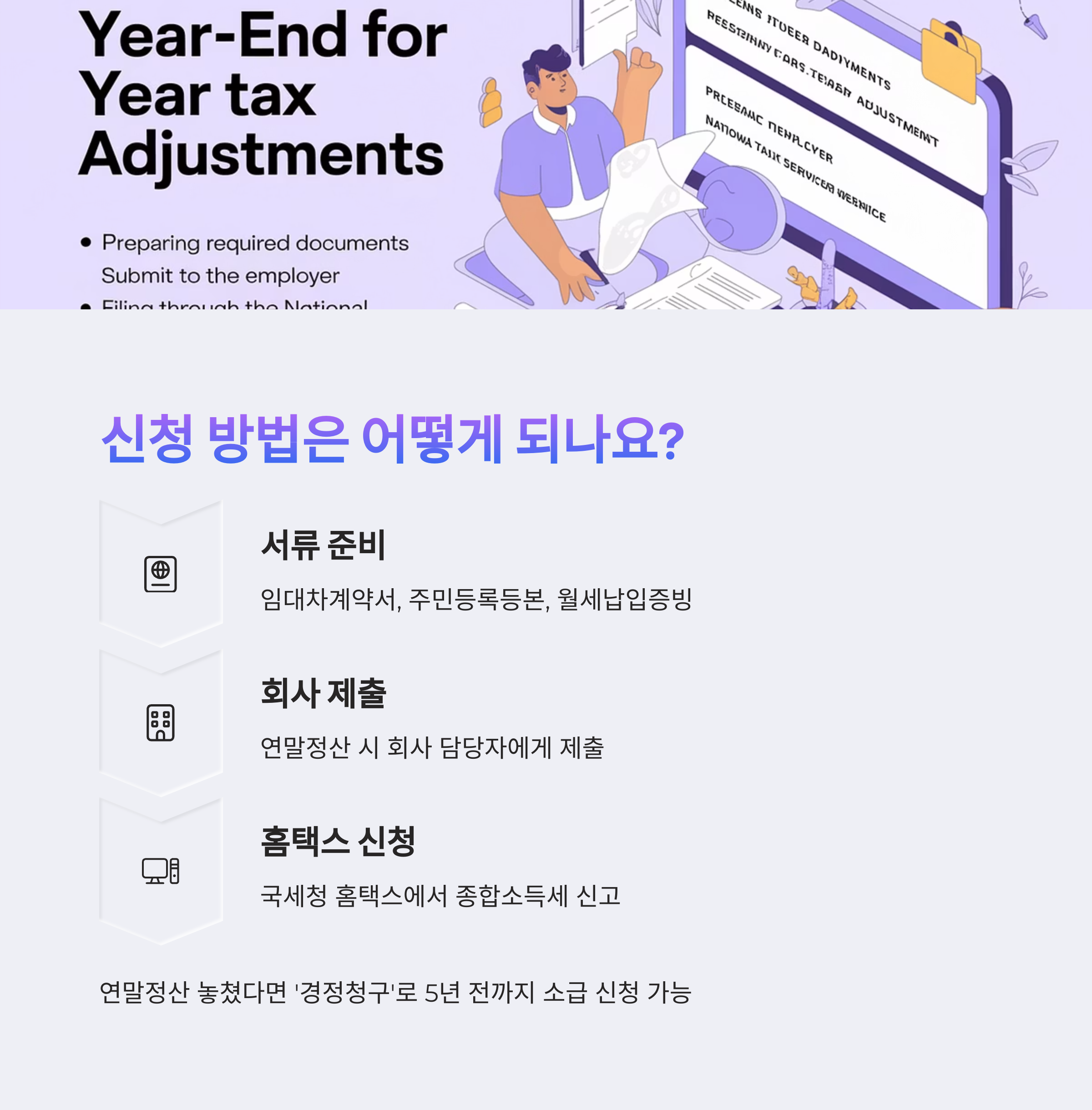 만약 연말정산 기간을 놓쳤다면, '경정청구'를 통해 최대 5년 전까지 소급하여 환급 신청이 가능합니다 .​
