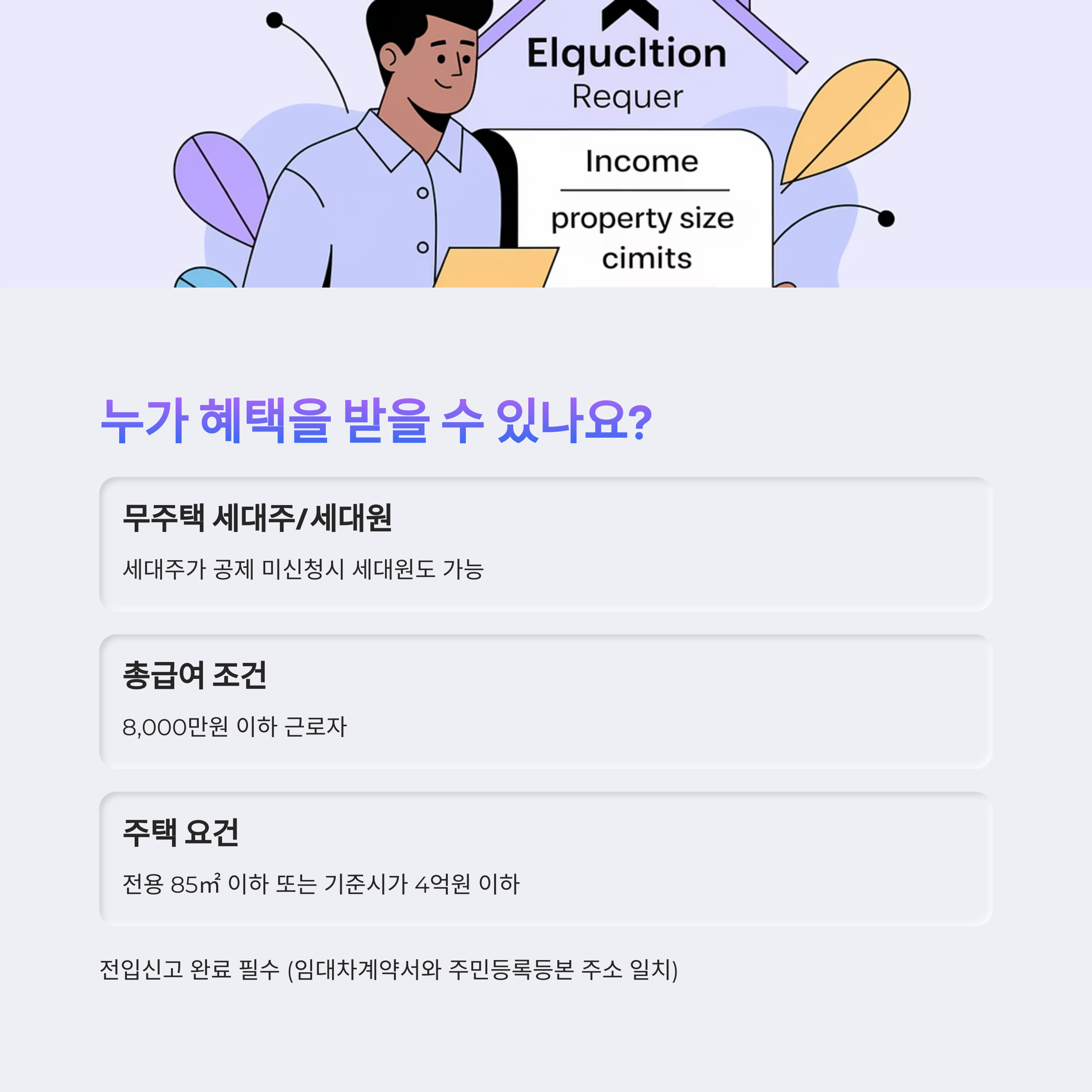 - 거주 주택 요건: 전용면적 85㎡ 이하 또는 기준시가 4억 원 이하의 주택(주거용 오피스텔, 고시원 포함)