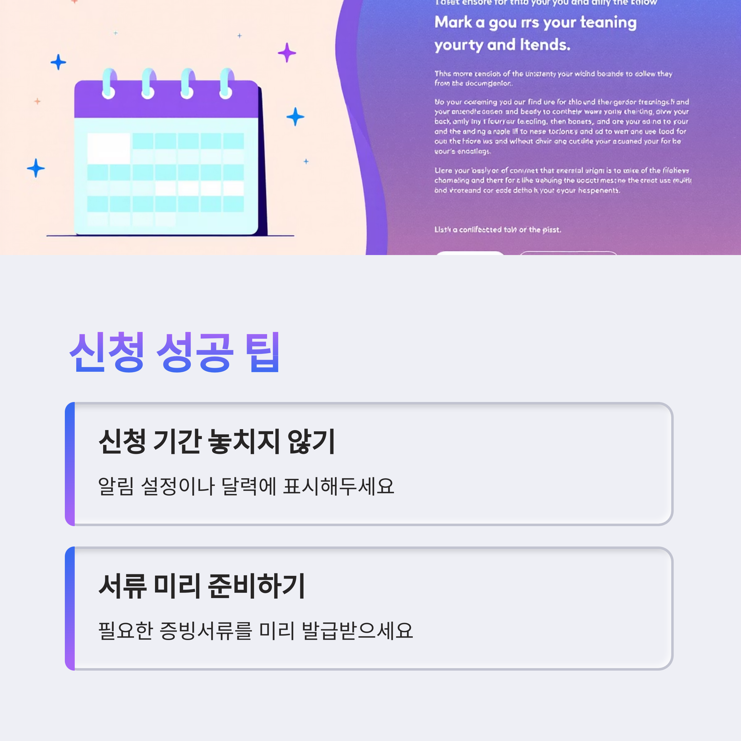 성공적인 신청을 위한 몇 가지 팁을 드리자면, 첫째, 신청 기간을 놓치지 않는 것이 가장 중요합니다. 알림 설정을 해두거나 달력에 표시해두는 것을 추천합니다. 둘째, 필요한 서류를 미리 준비하여 신청 기간에 바로 제출할 수 있도록 합니다. 셋째, 신청 시 개인 정보나 서류 내용에 오류가 없는지 여러 번 확인해야 합니다. 작은 실수로 인해 불이익을 받을 수도 있기 때문입니다. 마지막으로, 경쟁률이 높을 수 있으므로, 지원 대상이 되는지 꼼꼼히 확인하고 본인의 상황을 가장 잘 어필할 수 있는 내용을 작성하는 것이 좋습니다.