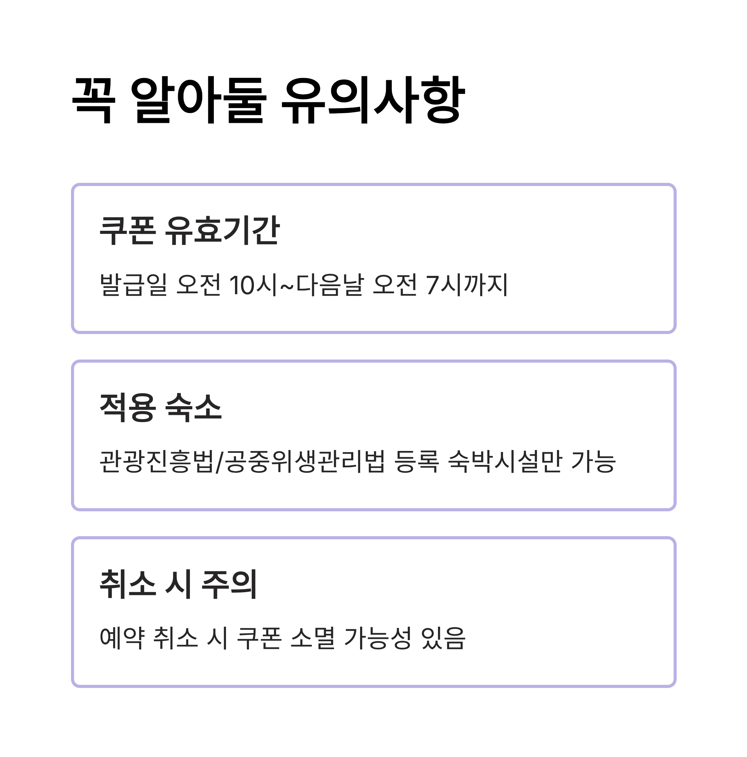 - 쿠폰 적용 숙소: 쿠폰은 '관광진흥법'이나 '공중위생관리법' 등에 등록된 국내 숙박시설에만 적용됩니다. 대실이나 미등록 시설은 할인이 불가하니 반드시 확인해야 합니다.