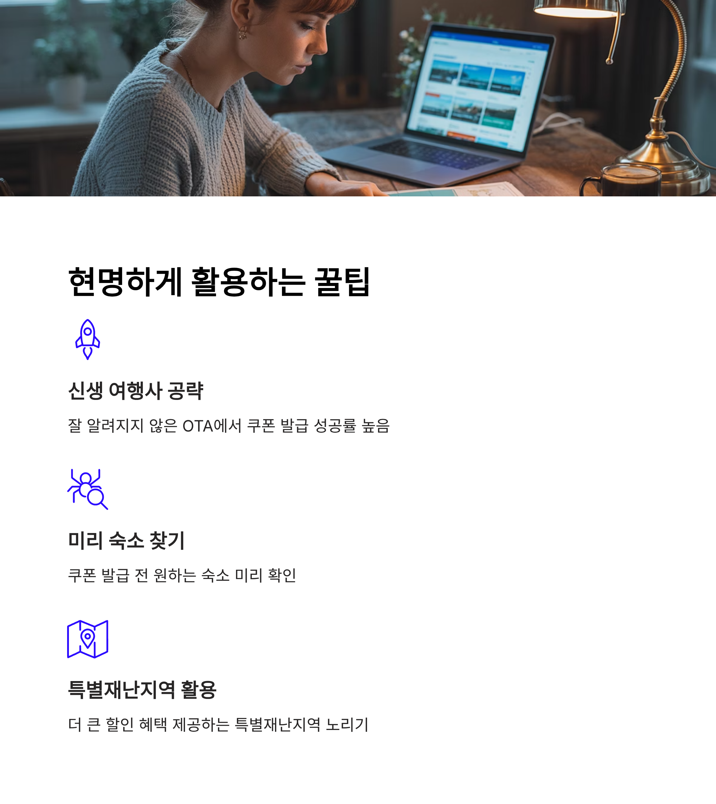 - 미리 숙소 찾아보기: 쿠폰 발급 전에 미리 가고 싶은 지역과 숙소를 찾아보는 것이 좋습니다. 원하는 숙소가 쿠폰 적용 대상인지, 가격은 얼마인지 미리 파악해두면 쿠폰을 받자마자 빠르게 예약할 수 있습니다.