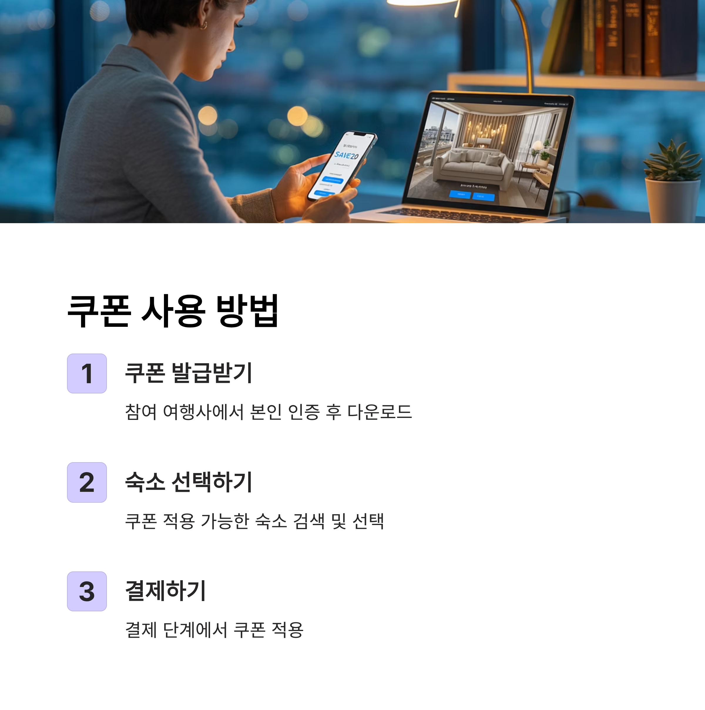 - 숙소 선택: 쿠폰 적용이 가능한 숙소(호텔, 리조트, 펜션 등)를 검색하고, 원하는 상품을 선택합니다.
