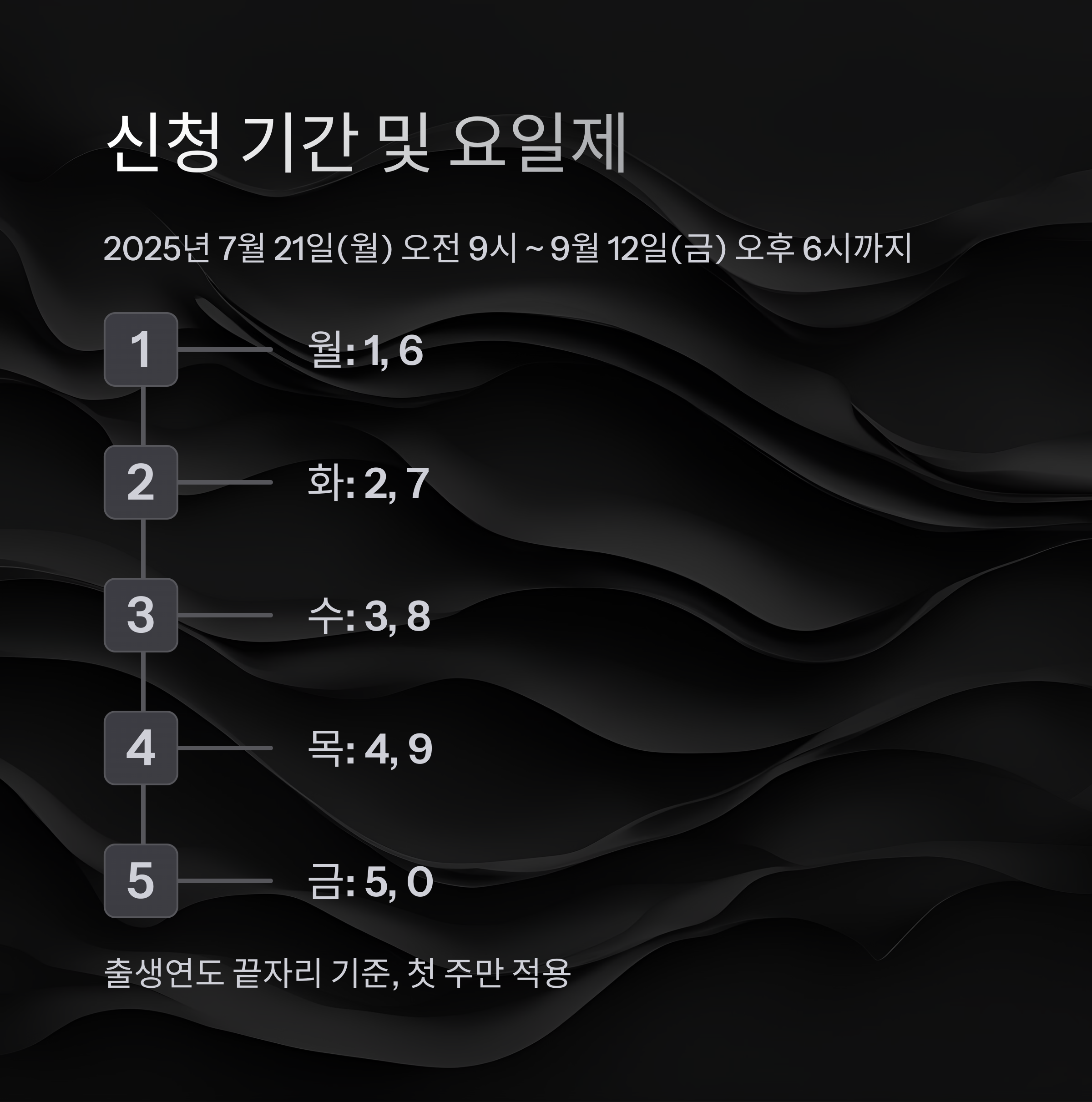 - 신청 첫 주(7월 21~25일): 혼잡 방지를 위해 ‘요일제’ 적용