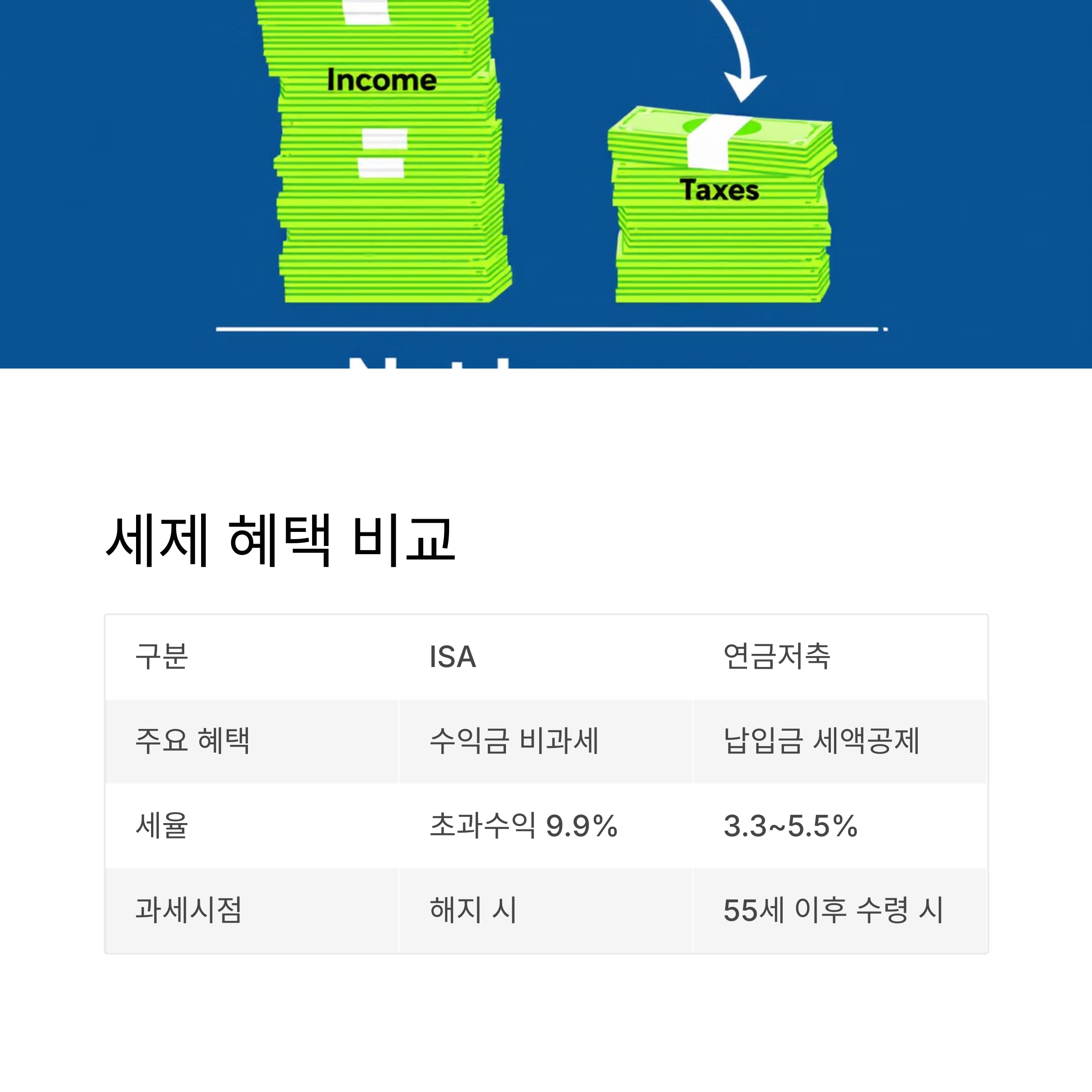 - ISA와 연계: ISA에서 5년간 수익을 낸 후, 연금저축으로 이체해 추가 세액공제 받기.