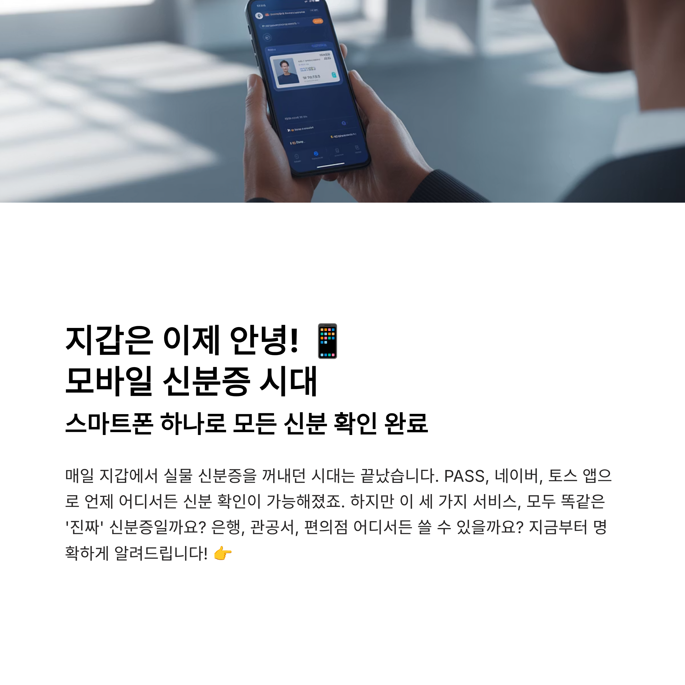 여러분! 매일매일 지갑에서 실물 신분증을 꺼내야 했던 시대는 이제 안녕입니다. 스마트폰만 있으면 언제 어디서든 신분 확인이 가능한 모바일 신분증 시대가 활짝 열렸습니다. 그런데 잠깐! 우리가 흔히 쓰는 PASS(패스), 네이버, 토스 앱에서도 신분증 서비스를 제공하고 있죠. 과연 이 서비스들이 모두 똑같은 '진짜' 신분증일까요? 은행, 관공서, 편의점 어디서든 쓸 수 있을까요?