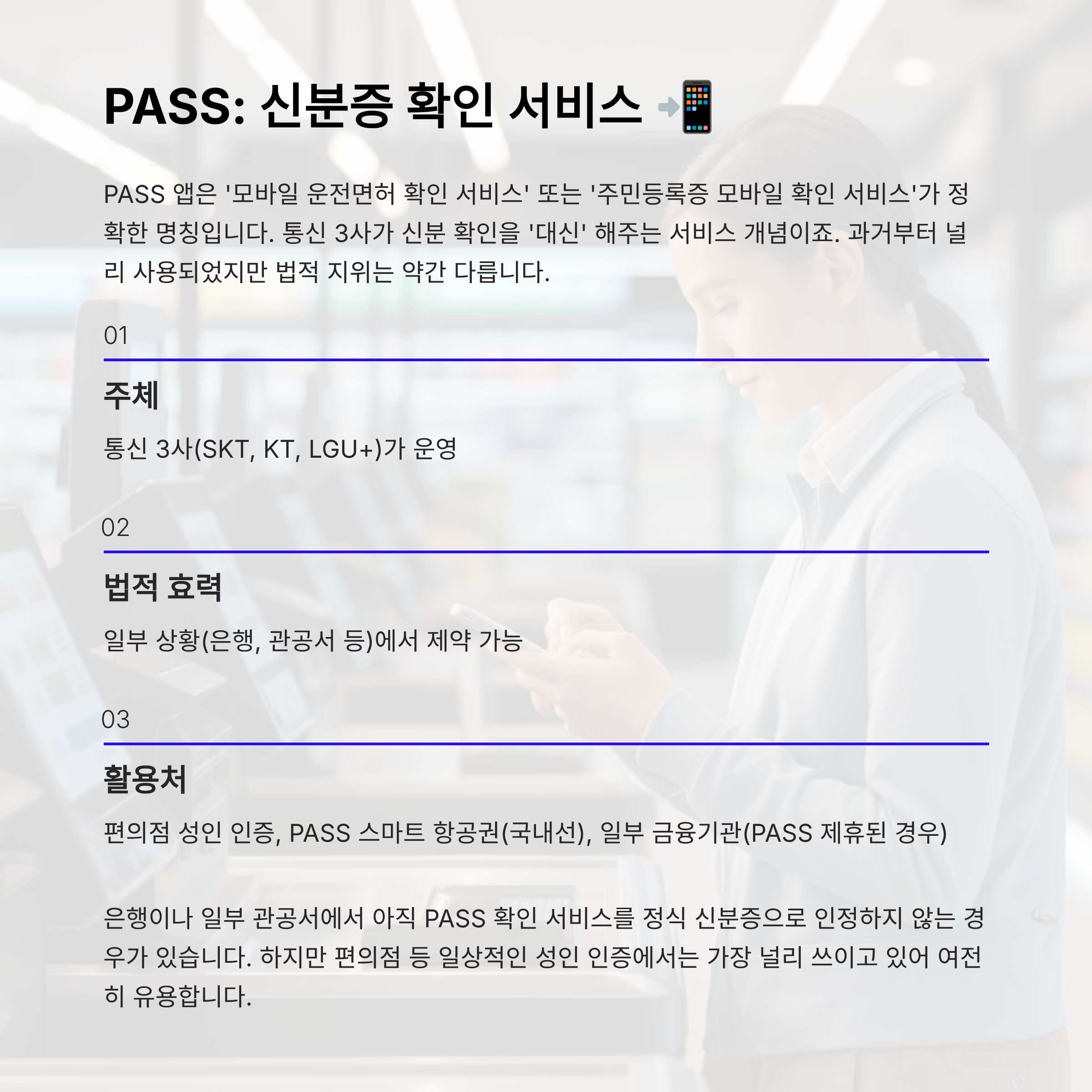 - 활용처: 편의점 성인 인증, PASS 스마트 항공권(국내선), 일부 금융기관(PASS 제휴된 경우) 등