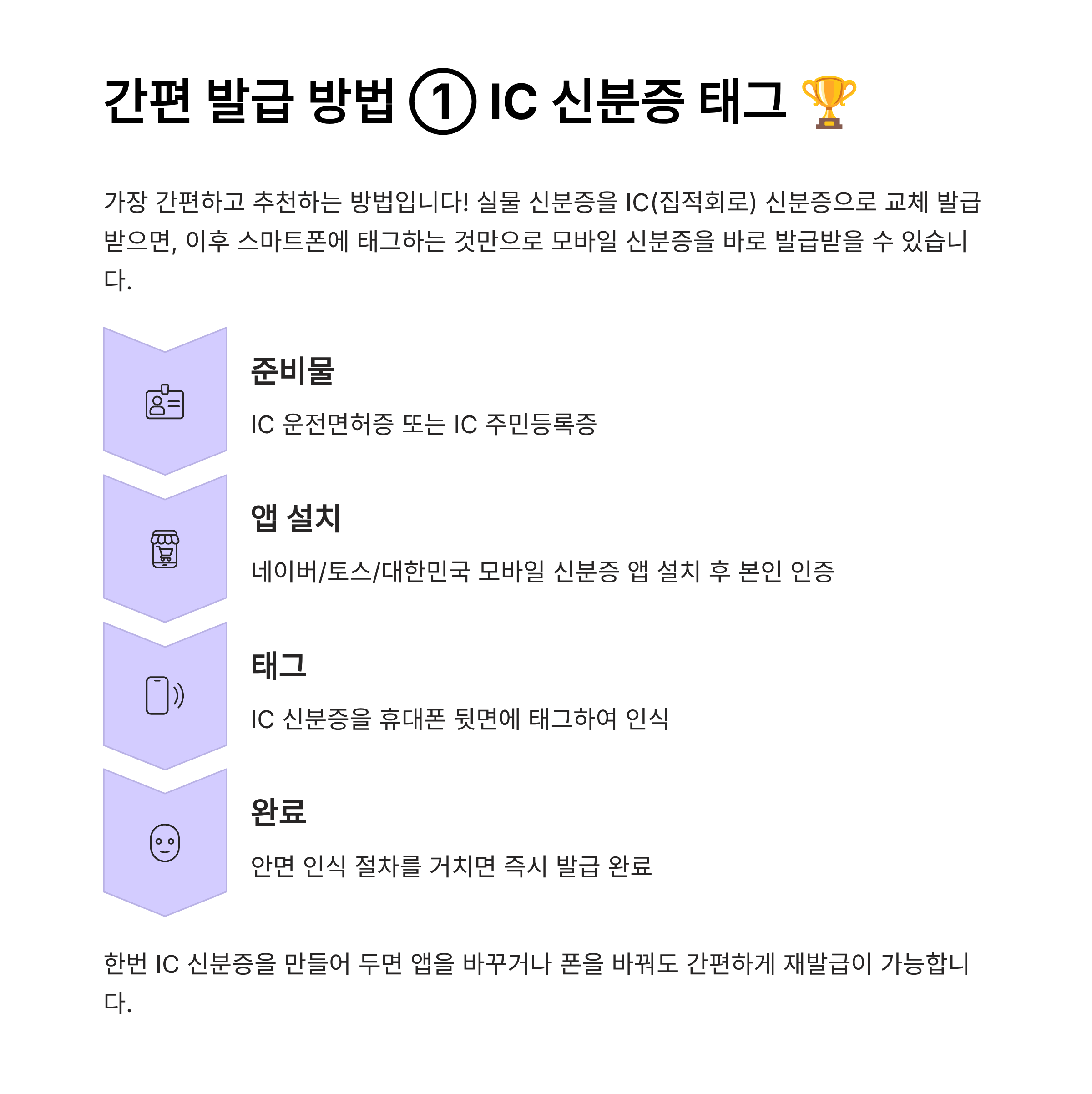 가장 간편하고 추천하는 방법입니다. 실물 신분증을 IC(집적회로) 신분증으로 교체 발급받으면, 이후 스마트폰에 태그하는 것만으로 모바일 신분증을 바로 발급받을 수 있습니다.